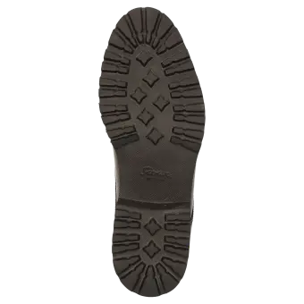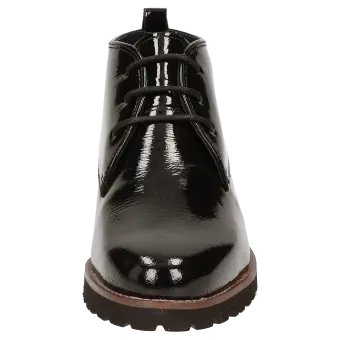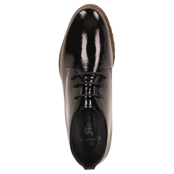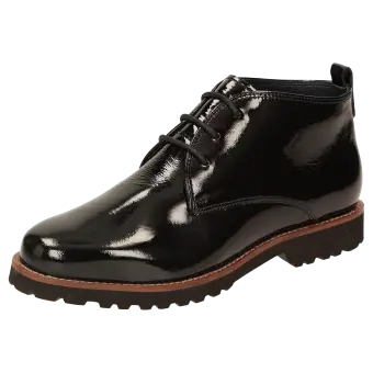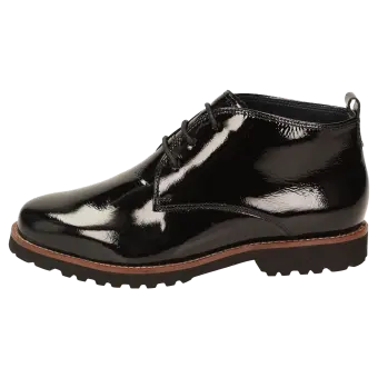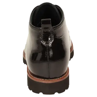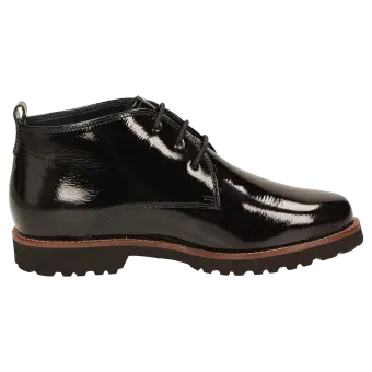 Women's lace-up shoe in a broad H width with a loop on the heel. Crafted from slightly waulked patent leather; leather-lined and featuring a stretch fabric lining at the forefoot. These are bunion-friendly shoes. Removable, leather-covered insole with soft cushioning - can be replaced with a bespoke insole. Lightweight rubber sole featuring a rugged profile and a striking leather welt.