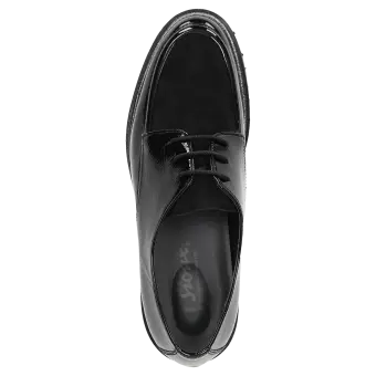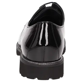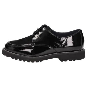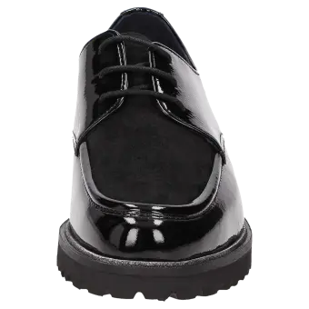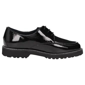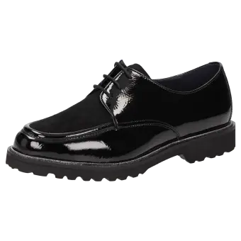 Women's lace-up shoe in a comfort width (H) with stylish, decorative stitching on the vamp. It is crafted from a mix of crinkled patent leather and extremely supple lamb suede on the vamp. This shoe is leather-lined and features a stretch fabric lining in the forefoot area. These are bunion-friendly shoes! Removable, leather-covered insole with soft cushioning - can be replaced with a bespoke one. It has a lightweight, autumnal-looking, cleated, rubber sole and an on-trend glittery welt.