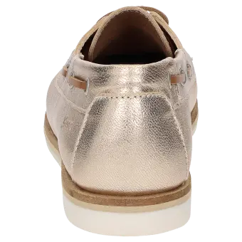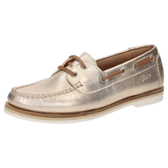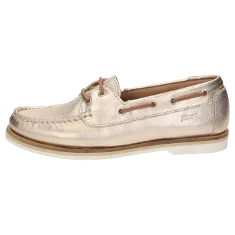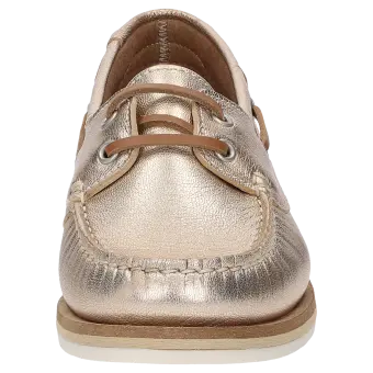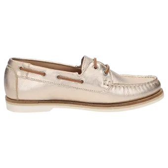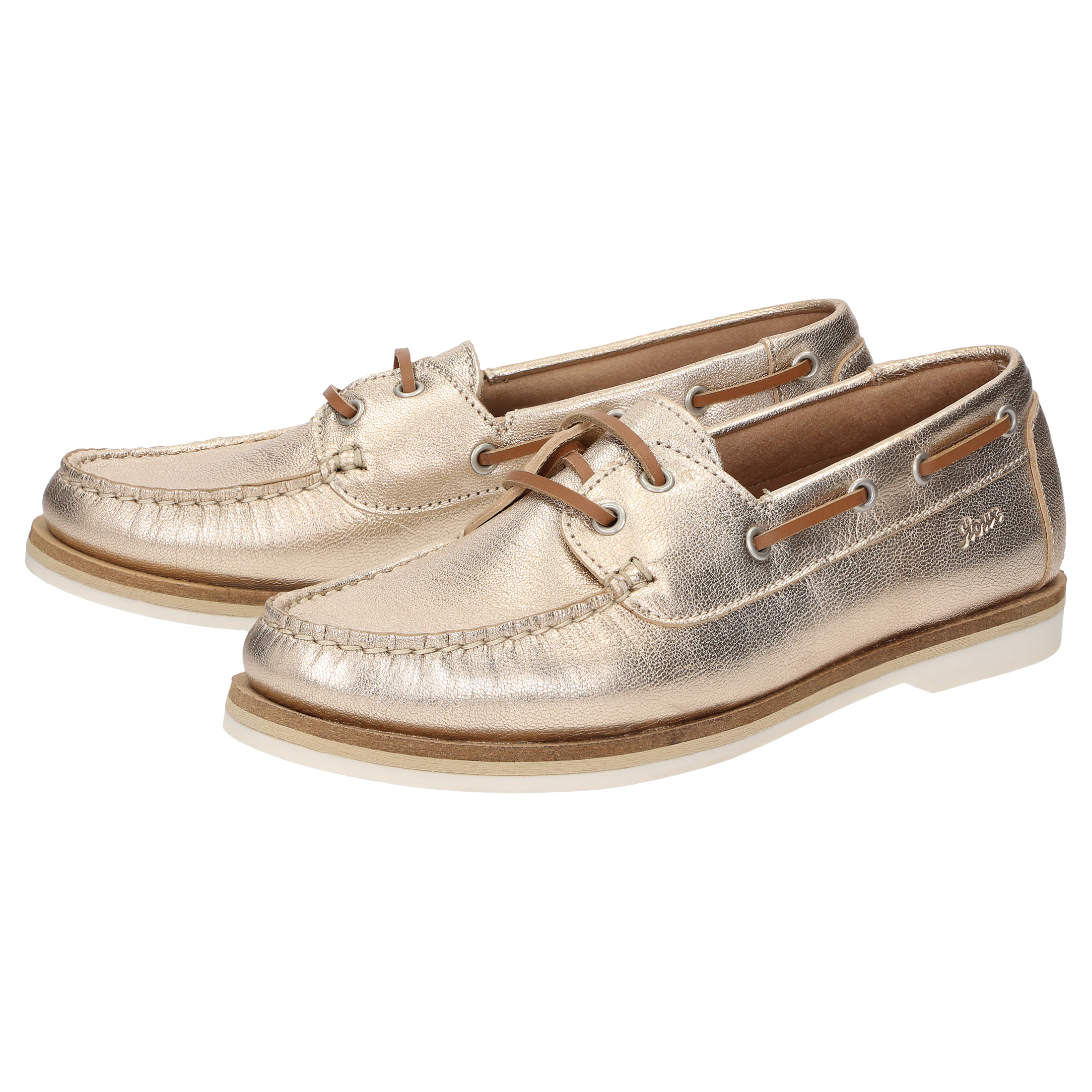 Women's sporty lace-up resembling a deck shoe (docksider) made of metallic goat leather that is unlined. This model comes with a cushioned leather insole that can be replaced with a bespoke one. Soft, thin rubber sole with a slight heel pitch, and a comfy G width for a roomy fit at the toes.