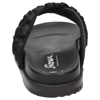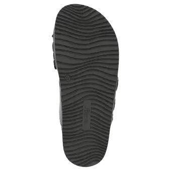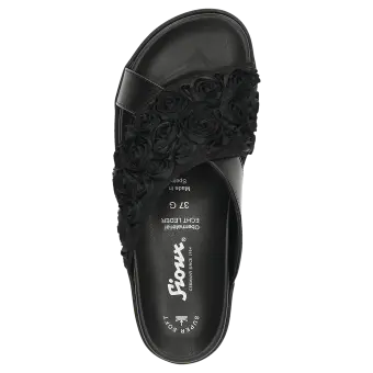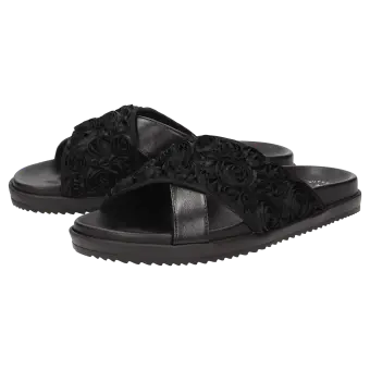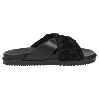 Elegant slider sandal crafted from lamb nappa leather in a modern look. An elaborate nylon floral appliqué on the wider strap makes for an eye-catching design. A rippled rubber sole ensures good traction.