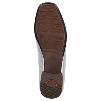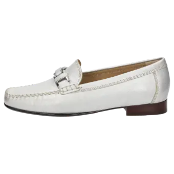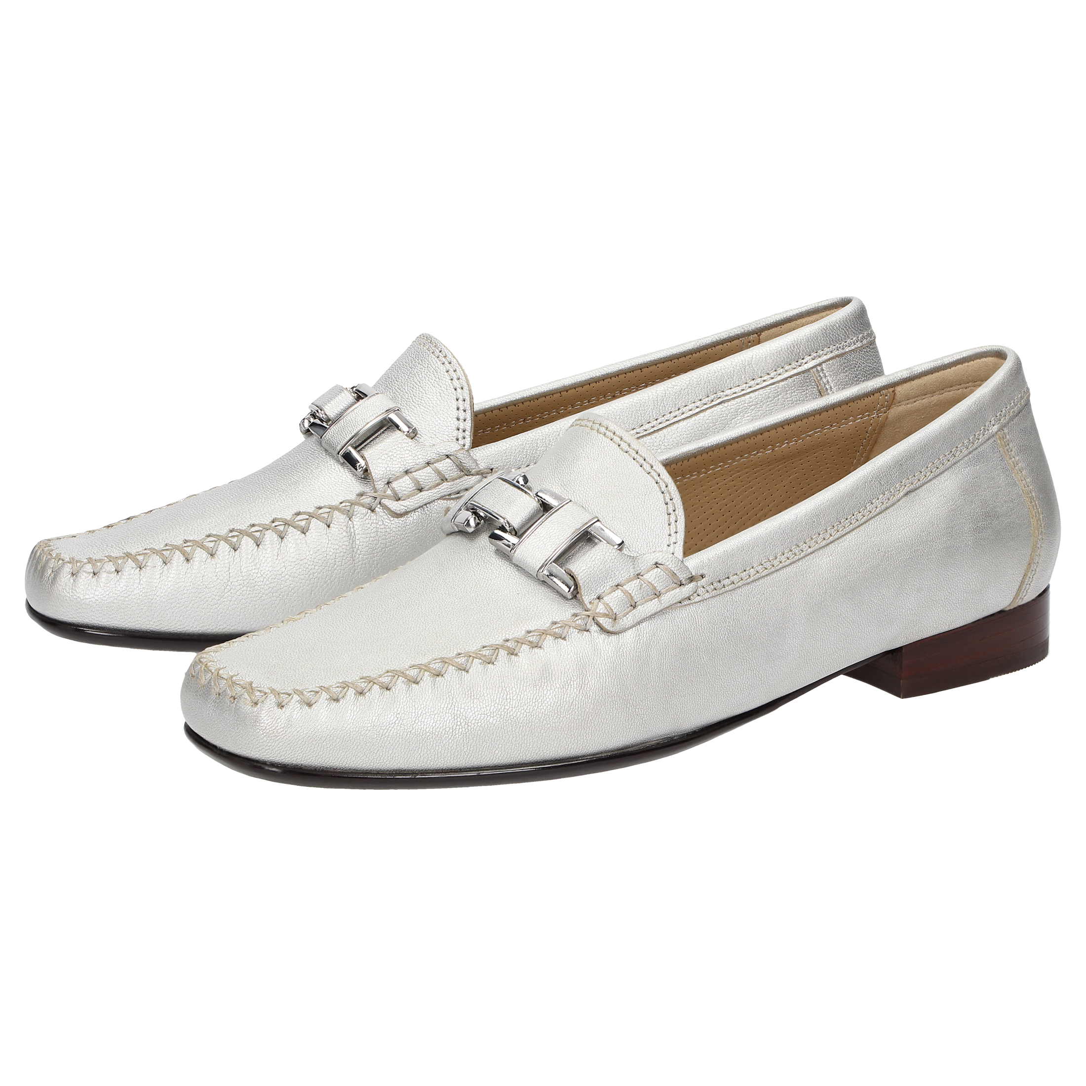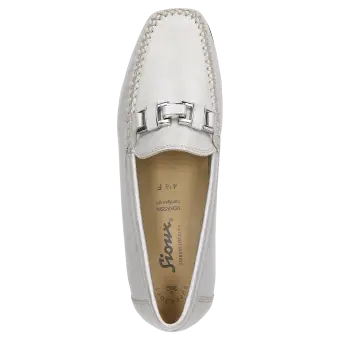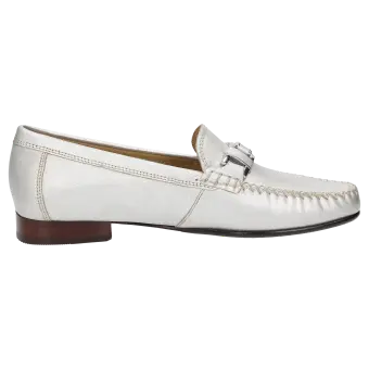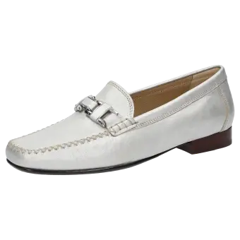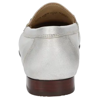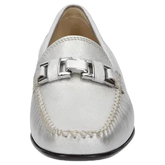 Women's moccasin-style slip-on in a slim F width crafted from metallic goat leather. This model offers an enhanced fit and timeless elegance with an eye-catching metal and leather snaffle trim. It is lined with leather and features a full-length leather cushioned insole. Flexible and thin rubber sole with a flat heel. Women's typical moccasin by Sioux.