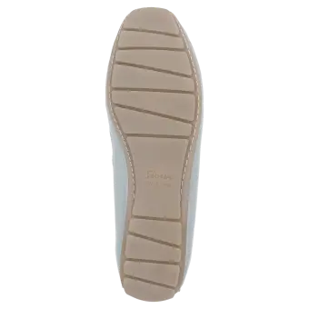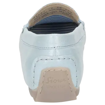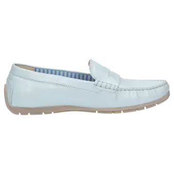 Women's flat, moccasin-style slip-on made of supple goat leather with a metallic sheen. There is a penny trim on the tongue. It is lined throughout with fabric and features a soft, cushioned insole that can be replaced with a bespoke one. Flat and soft rubber sole, which is raised at the heel, making it an ideal choice for car drivers. The comfy width (G) ensures a roomy fit at the toes.