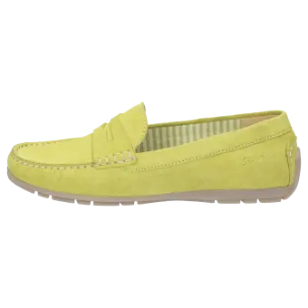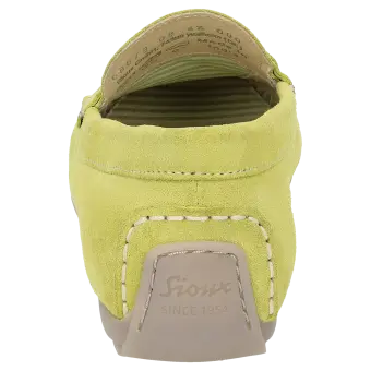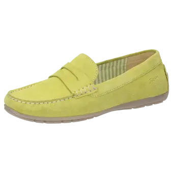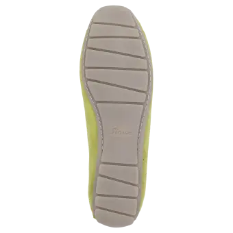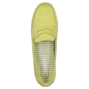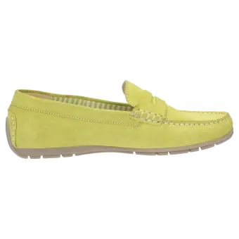 Women's flat slip-on shoe in a moccasin style made of elegant calf suede with an on-trend penny-loafer trim. It is lined throughout with fabric and features a soft, cushioned insole that can be replaced with a bespoke one. Flat and soft rubber sole, which is raised at the heel, making it an ideal choice for car drivers. The comfy width (G) ensures a roomy fit at the toes.
