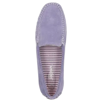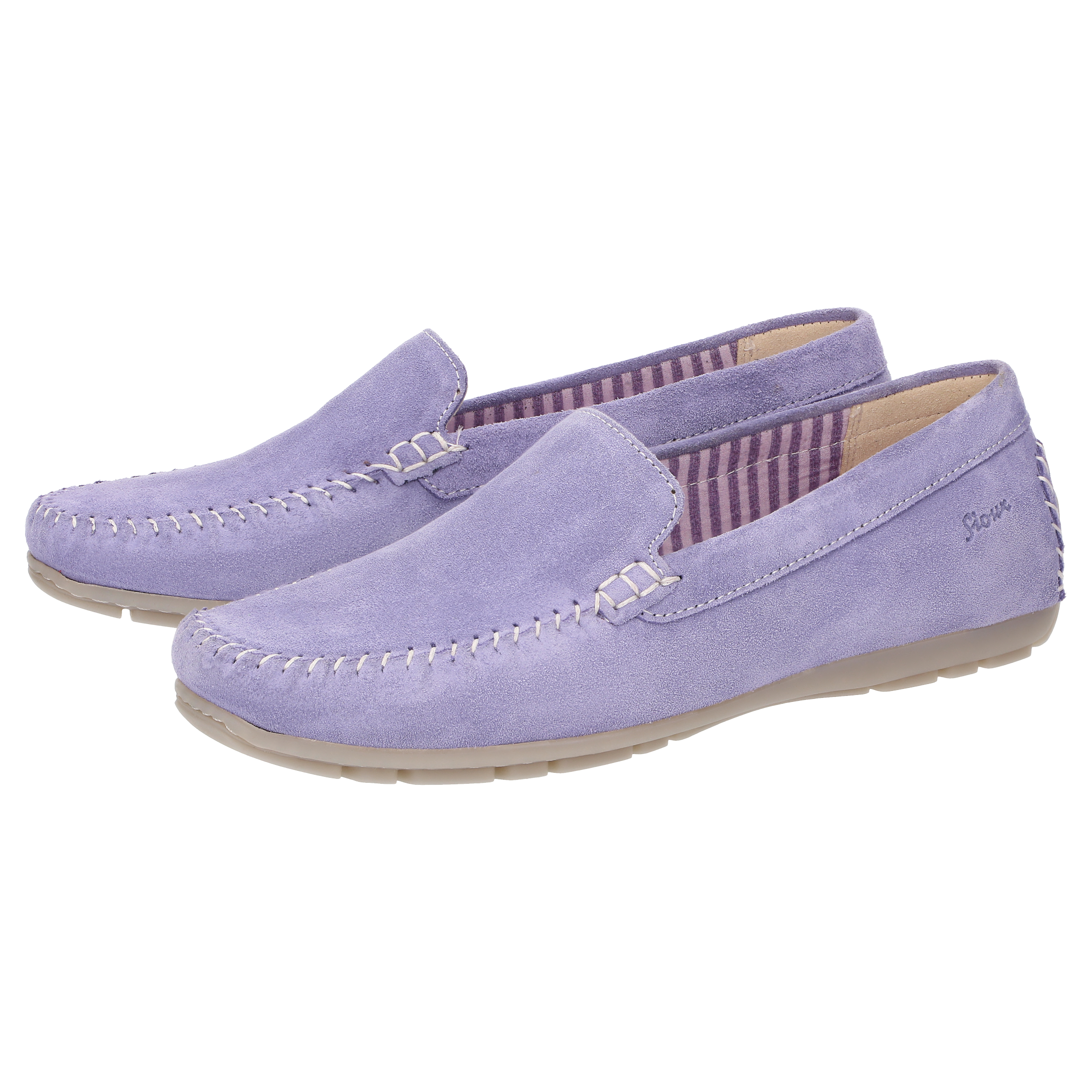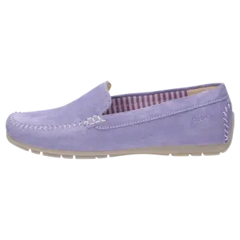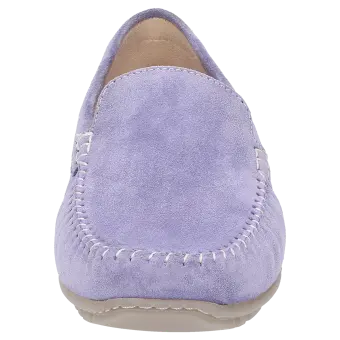 Classic women's flat, moccasin-style slip-on made of elegant calf suede. It is lined throughout with fabri and features a soft, cushioned insole that can be replaced with a bespoke one. Flat and soft rubber sole, which is raised at the heel, making it an ideal choice for car drivers. The comfy width (G) ensures a roomy fit at the toes.