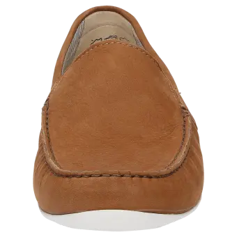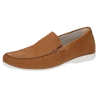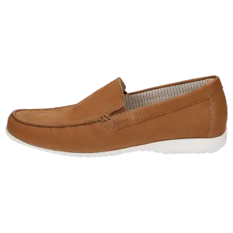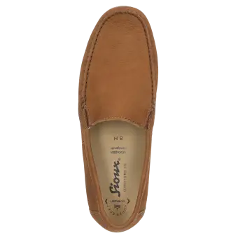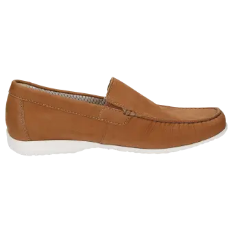 Men's moccasin-style loafer in a comfort H width is crafted from waxed calf nubuck leather and lined with a lightweight summery fabric. The leather-covered cushioned and removable insole can be replaced with a bespoke one. The elasticated inserts at either side of the tongue make it easy to put on and take off the shoe as well as enhance the fit. The lightweight rubber sole makes this model perfect for wearing throughout the day.