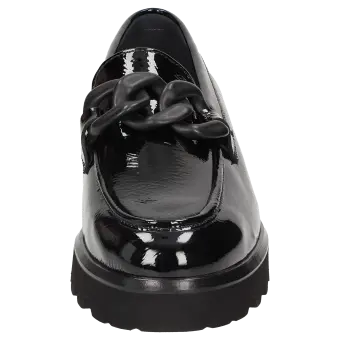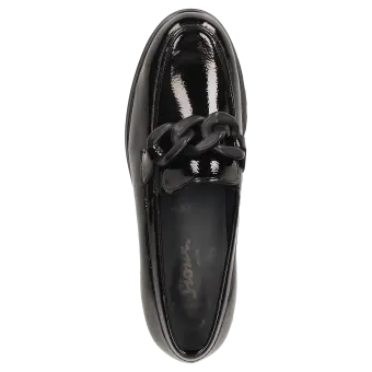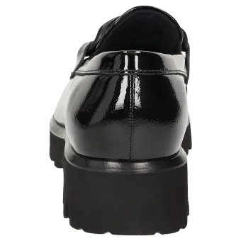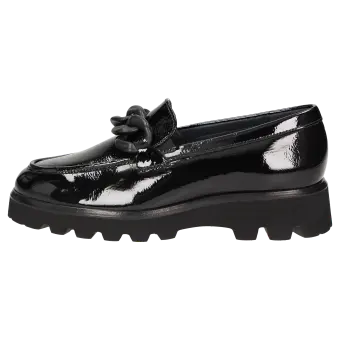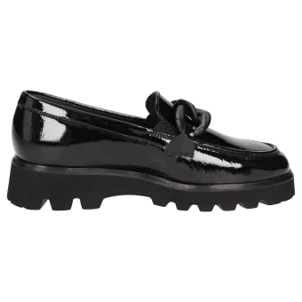 Women's slip-on in a comfort width (H) with a stylish trim and small, elasticated inserts at the tongue for an enhanced fit. Crafted with crinkled patent calf leather and lined with calfskin, featuring a stretchy textile section at the front. These are bunion-friendly shoes! Removable, leather-covered insole with soft cushioning - can be replaced with a bespoke insole. A thick, cleated lightweight rubber sole and the feather edge round off this model.