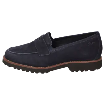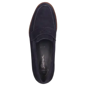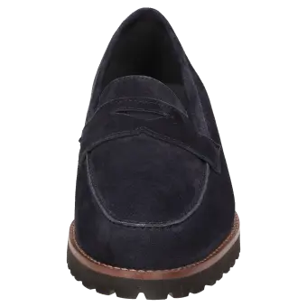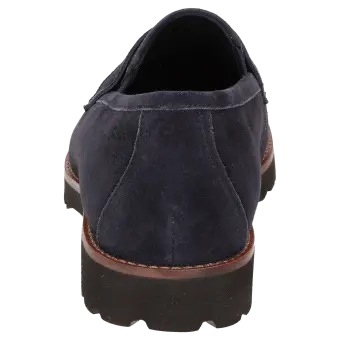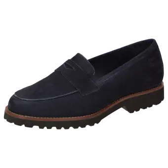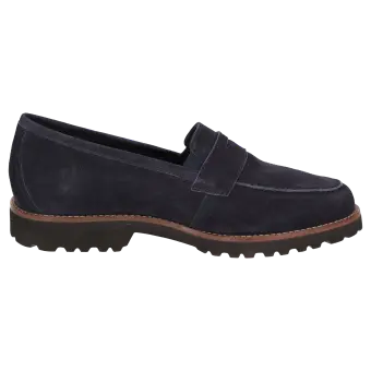 Women's college-style looking slip-on in a broad H width featuring a penny-loafer trimming. Crafted with supple lambskin suede and lined in leather, featuring a stretch fabric section at the front. These are bunion-friendly shoes. Removable, leather-covered insole with soft cushioning - can be replaced with a bespoke insole. Lightweight rubber sole featuring a rugged profile and a striking leather welt.
