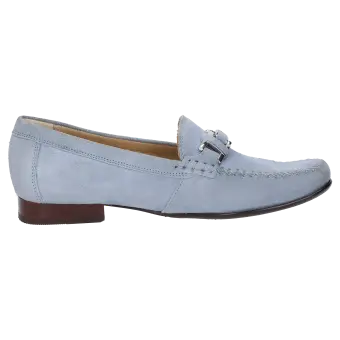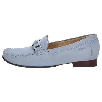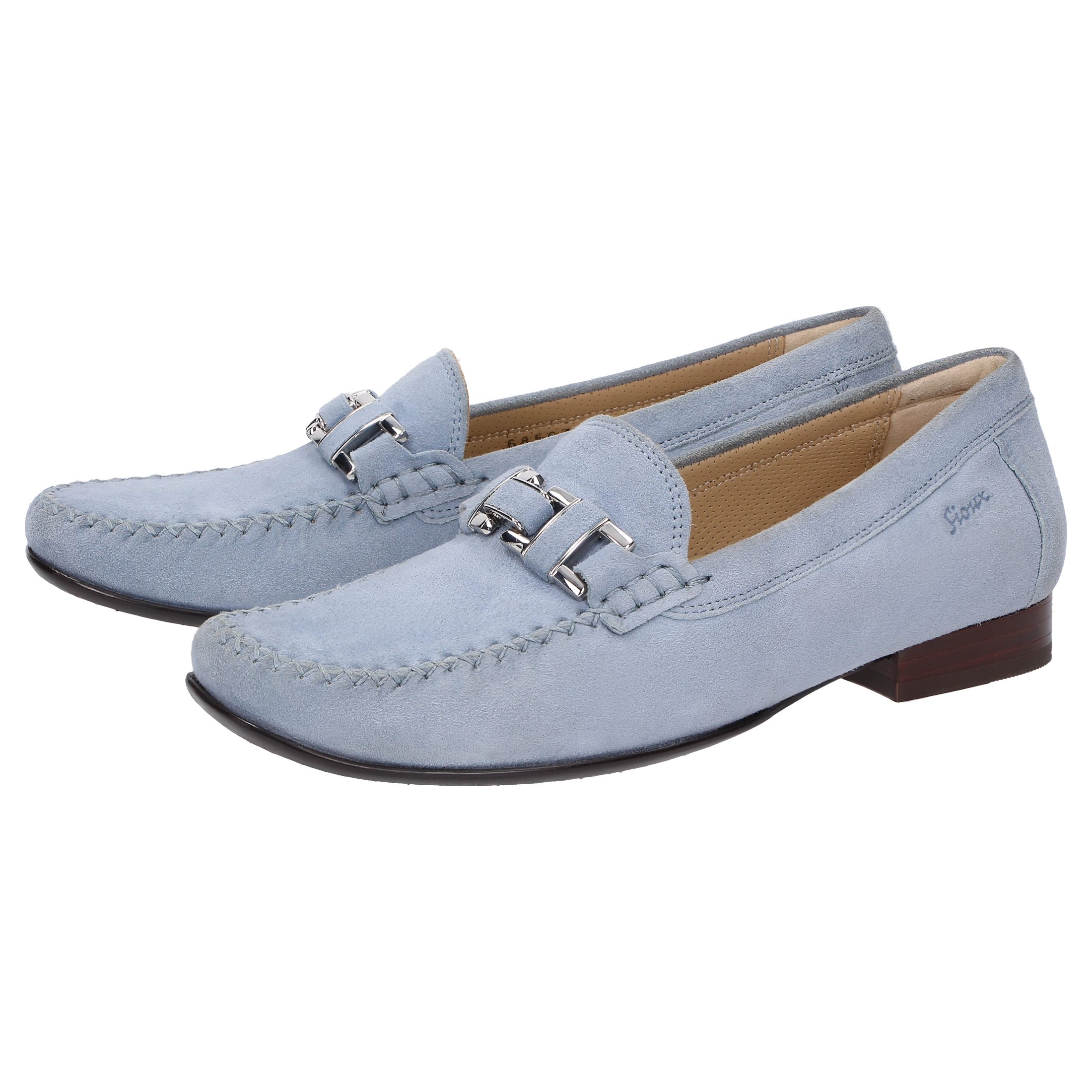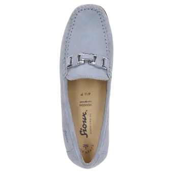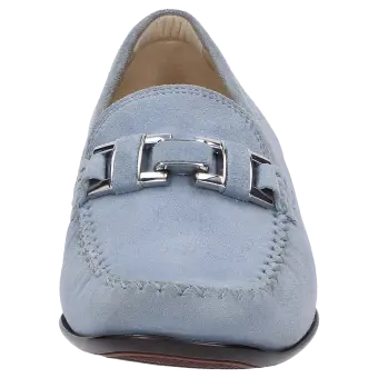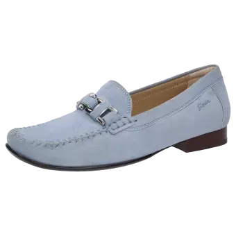Loafer plat pour femme en cuir velours de chèvre fin, confectionné en largeur F selon la méthode de fabrication de type mocassin pour un chaussant parfait. D'une élégance intemporelle avec son plastron mêlant le cuir et le métal. Doublure en cuir et première de propreté en cuir matelassée sur toute sa longueur. Semelle extérieure en caoutchouc fine et flexible avec talon plat. Un mocassin typique de la collection Sioux pour femme.