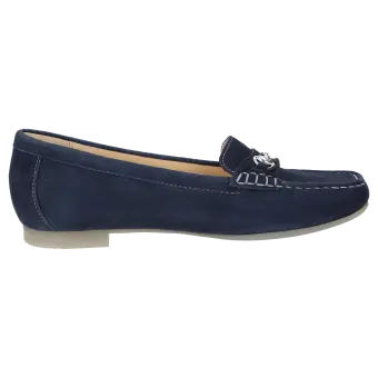 Mocassin casual d'un confort remarquable, avec décoration fantaisie à bridon. Le cuir velours de chèvre souple et la doublure cuir sont un ravissement pour le pied. La semelle intérieure amovible rembourrée et la semelle extérieure légère en caoutchouc, idéale en été, contribuent encore au confort du modèle.
