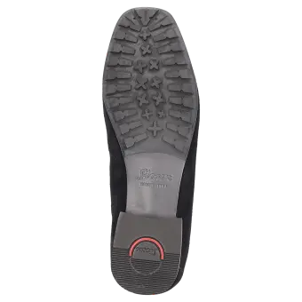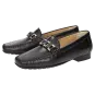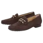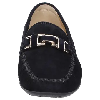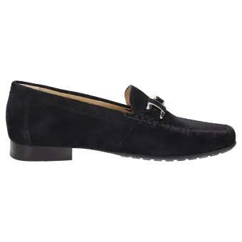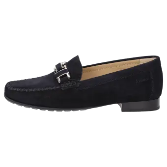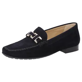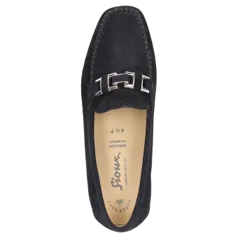 Platte dames-instapper in mocassin-maakwijze in F-wijdte, vervaardigd van fijn geitensuède. Uitstekende pasvorm en tijdloze elegantie, met als blikvanger een element in metaal en leer. Aan de binnenzijde met een leren voering en een zachte, doorlopende leren dekzool. Flexibele, licht geprofileerde rubberzool met platte hak. Een typische dames-mocassin van Sioux.