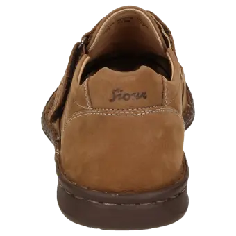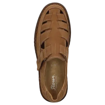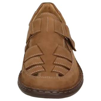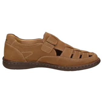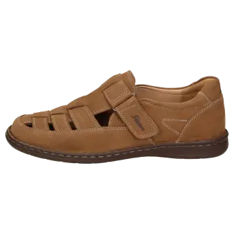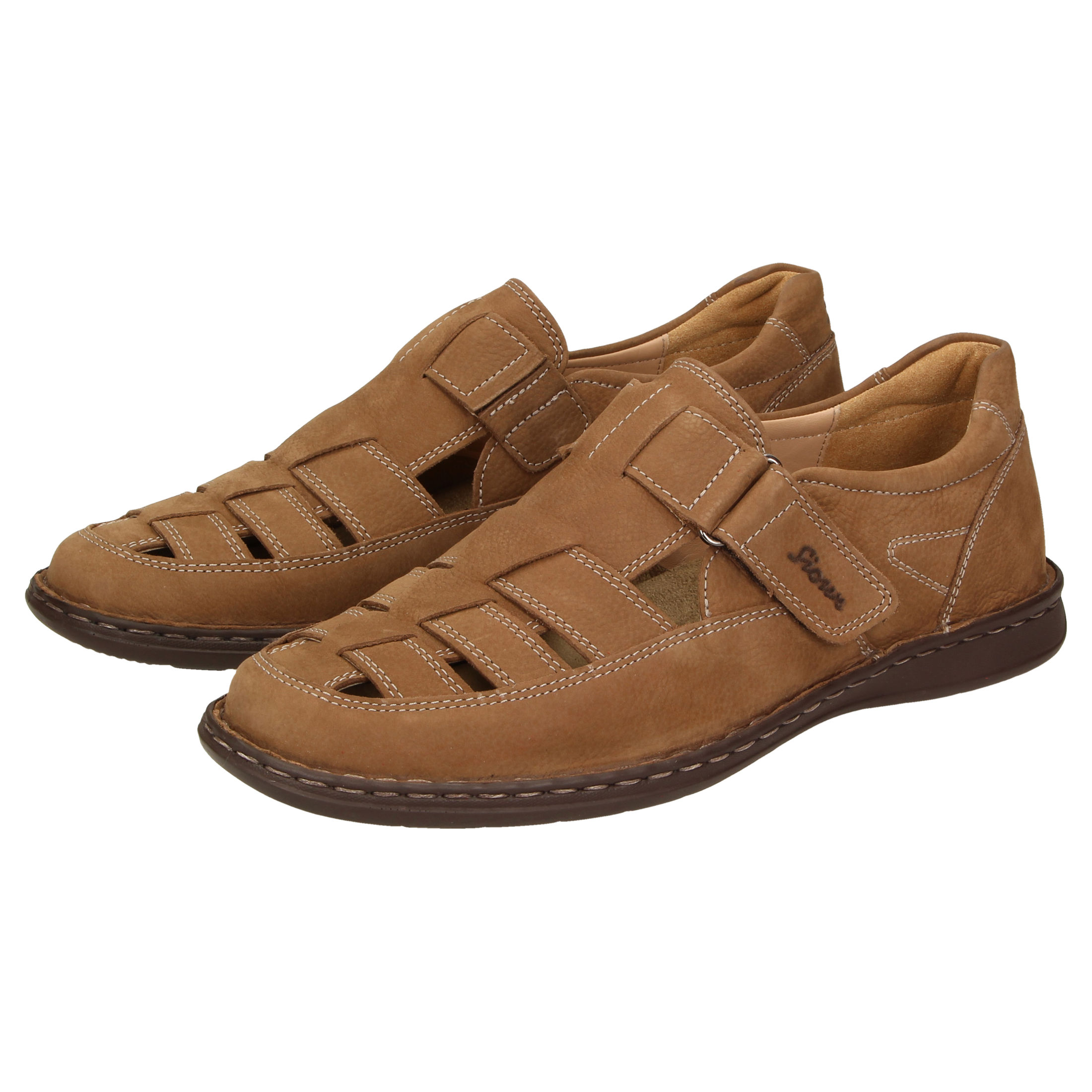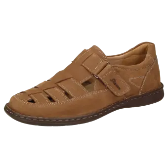 Zomerse, platte heren-instapper van licht generfd kalfsnubuck in normale G-wijdte, met de hand gestikte zoolnaad en verstelbare klitsluiting. Zacht gevoerd, met microvezel bekleed wisselvoetbed, eenvoudig te vervangen door de eigen inlegzool. De luchtige openingen en de verende PU-rubberzool zorgen voor een aangenaam draaggevoel.