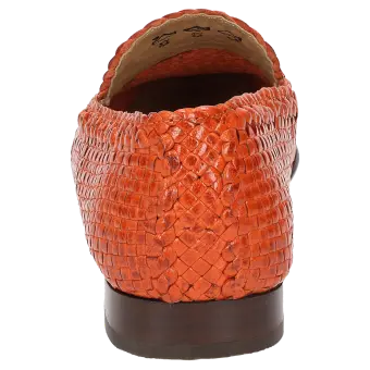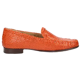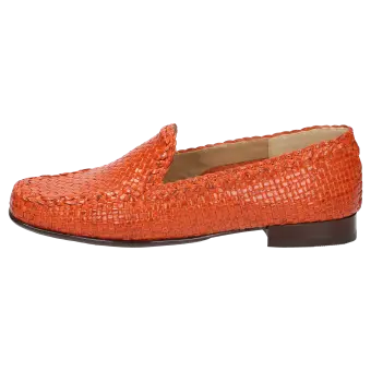 Platte dames-instapper van zacht, gevlochten geitenleer, met klein borduurelement aan de schachtrand en de tong. Ongevoerde damesschoen voor optimaal blootsvoets dragen. Bijzonder detail: de schacht wordt in handarbeid direct op de leest gevlochten om de optimale vorm te verkrijgen. Zacht gevoerde dekzool van kalfsleer. Zachte, fijne rubberzool met kleine haksprong, in schoenwijdte G.
