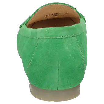 Vlotte mocassin met uitstekende comforteigenschappen en modieus trens-element. Het zachte geitensuède en de leren voering verwennen de voet. Extra comfort biedt de damesschoen met het gevoerde wisselvoetbed en de zomers lichte rubberzool.