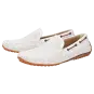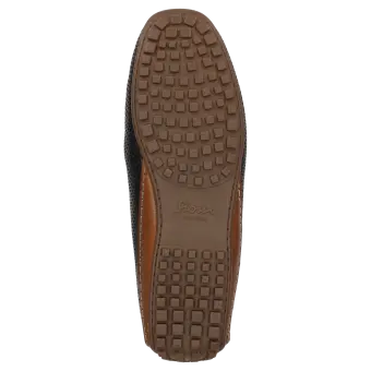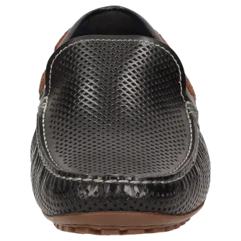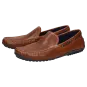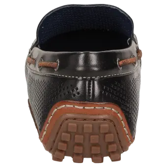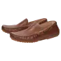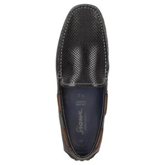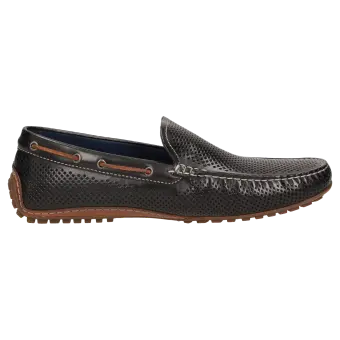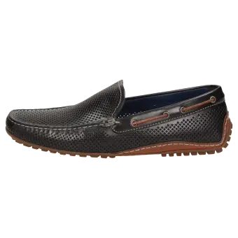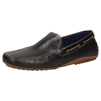 Sportlicher Herren-Mokassin-Slipper aus feinem Kalbnappa mit sommerlich luftiger Perforation. Das Modell hat ein Lederfutter und wird in normaler G-Weite handwerklich angefertigt. Die an der Ferse hochgezogene Autofahrer-Gummi-Noppensohle und das herausnehmbare, lederbezogene Wechselfußbett sorgen für einen angenehmen Auftritt.